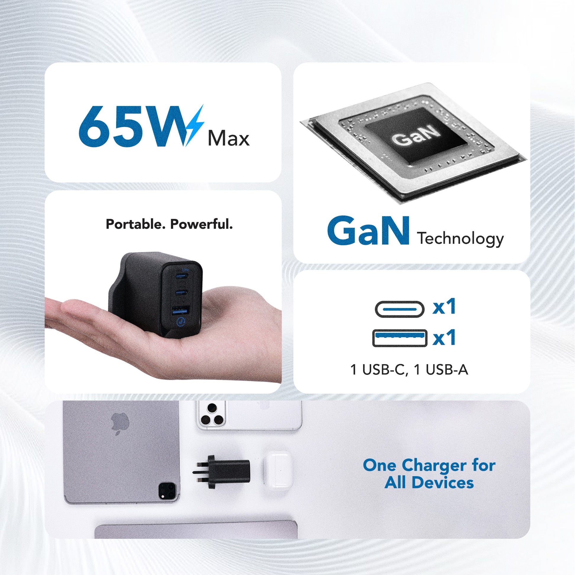 With up to 65W fast charging output and 2 Type-C + 1 USB-A ports, it powers smartphones, tablets, and USB-C laptops efficiently — all from a single compact charger.
