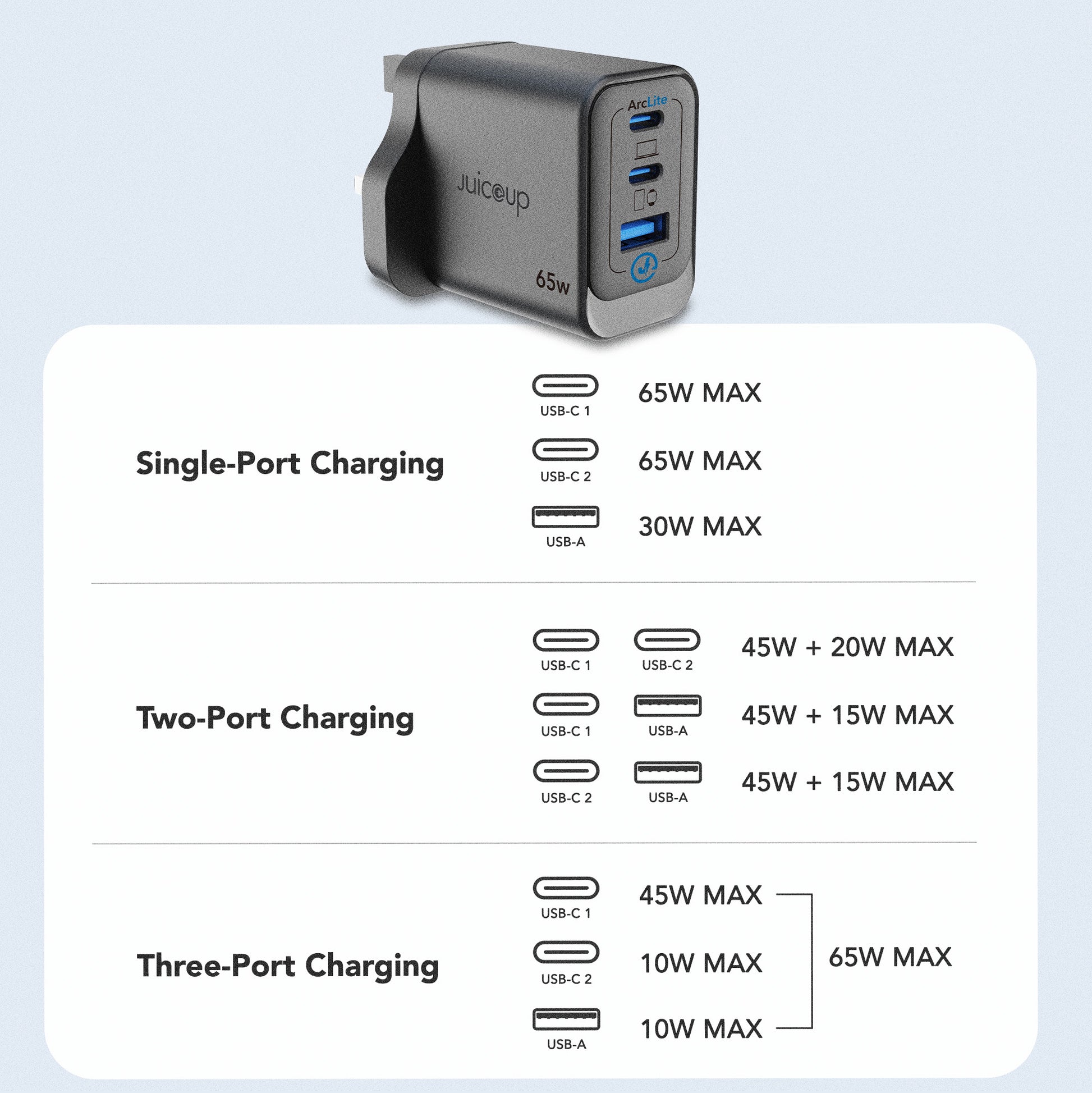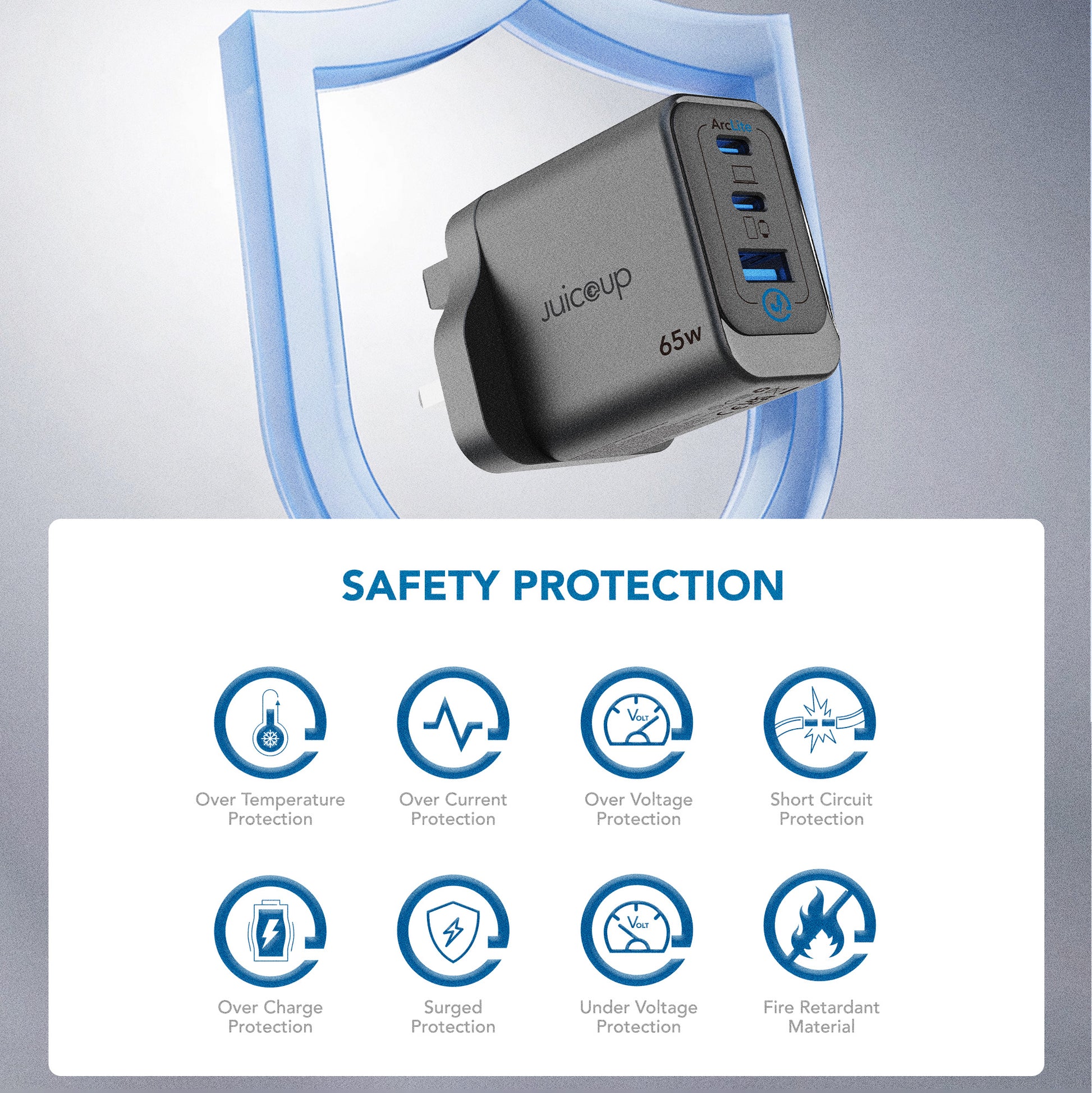 Meet the Juice Up AeroCharge 65W 2C1A Fast Charger — built for users who need serious power and flexibility.