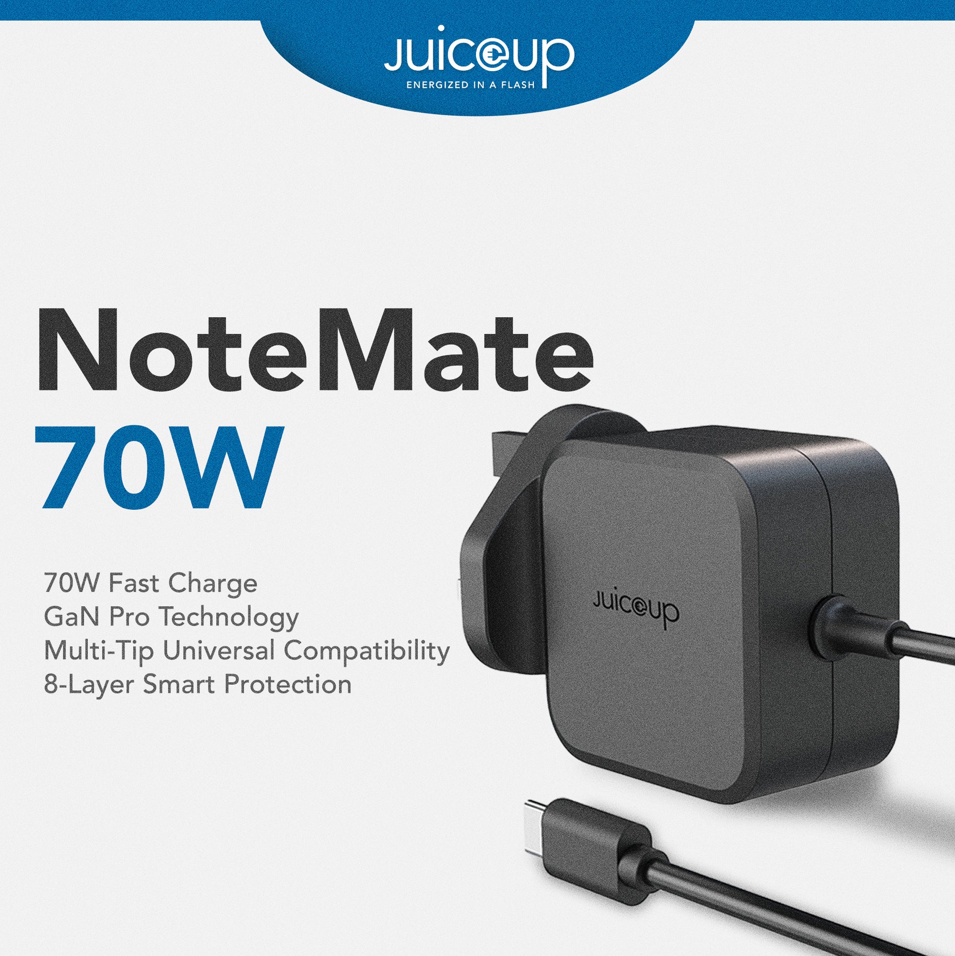Meet the Juice Up NoteMate 70W, a versatile charging solution designed to power multiple notebook brands with one compact adapter.